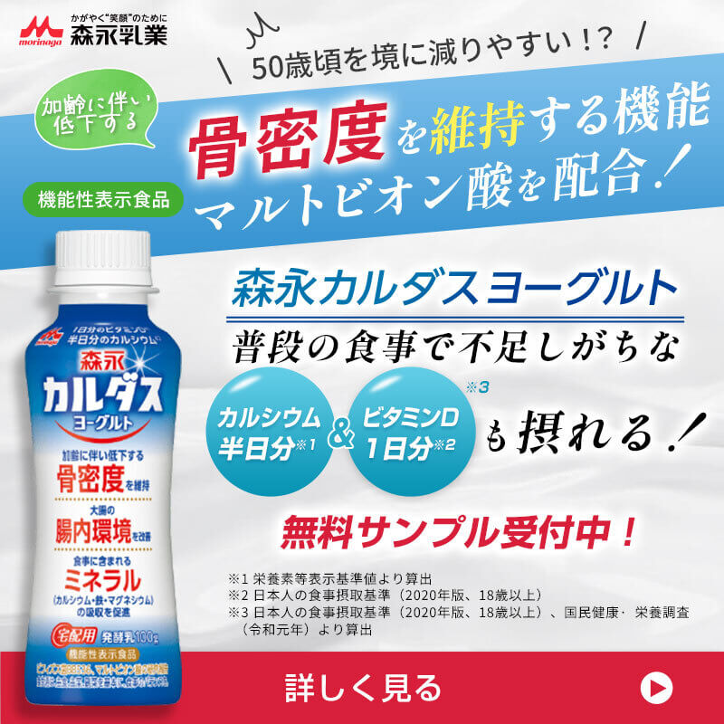 森永乳業の宅配では、「カルシウム」や「ビタミンD」を配合した乳製品や、「マルトビオン酸」がプラスされ「カルシウム」の吸収をサポートする商品などがあります!